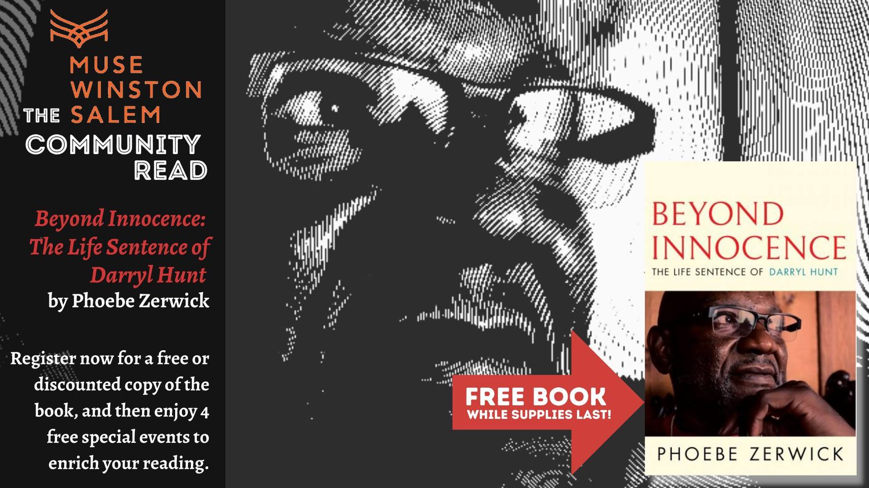 MUSE Winston-Salem announces a “Community Read” of Beyond Innocence: The Life Sentence of Darryl Hunt, by Phoebe Zerwick, released this month on Grove Atlantic press. MUSE Winston-Salem is partnering with the Wake Forest University Department of History, Bookmarks, a/perture cinema, and the Forsyth County Public Library to present these programs. Registrants are eligible to sign up for a free copy of the book thanks to the Wake Forest University Humanities Institute with support by a major grant from the National Endowment for the Humanities.