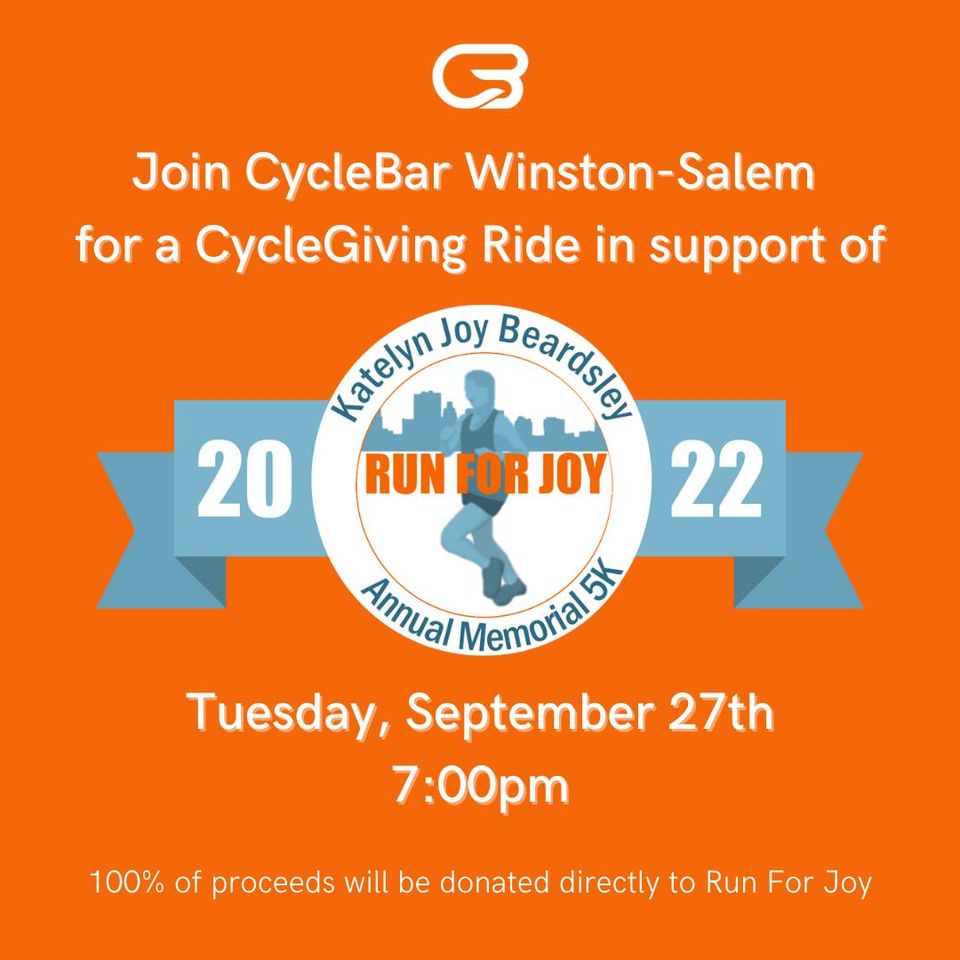 In partnership with Run For Joy, CycleBar Winston-Salem will be hosting a CycleGiving ride in support of Run For Joy – an Annual Memorial 5k in honor of Katelyn Beardsley.