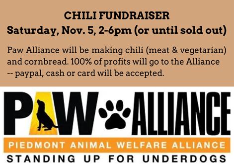Paw Alliance will be serving chili, cornbread and brownies with 100% of the proceeds going to their all volunteer animal welfare nonprofit.
